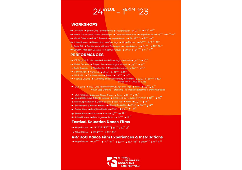 Festivalin sahne üstü performansları ve atölyeleri 27 Eylül - 1 Ekim tarihleri arasında çeşitli mekânlarda düzenlenecek. Akademik alanda uzman sanatçı akademisyenleri misafir eden festival, atölyeleri ile Türkiye’deki dans alanına katkı sağlamayı ve uluslararası eğitim eşitliği standartlarını yakalamayı hedefliyor.