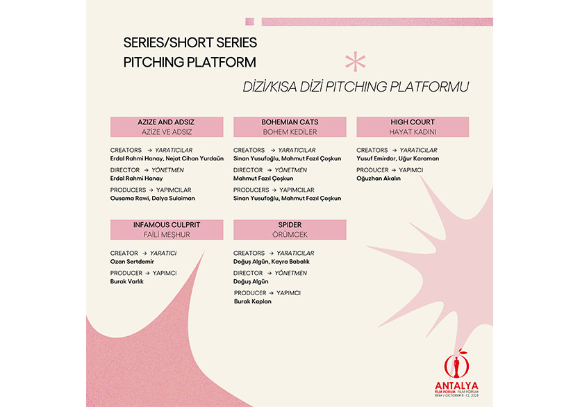 Özgün ve yaratıcı içerikleri desteklemeyi ve sektöre yeni isimler kazandırmayı amaçlayan Dizi/Kısa Dizi Pitching Platformu’na bu yıl beş proje seçildi. Netflix Grow Creative ekibinin Türkiye Yöneticisi Arya Su Altıoklar, Eccho Rights CEO’su Fredrik af Malmborg ve yönetmen, senarist Tunç Şahin’den oluşan seçici kurul tarafından; Azize ve Adsız (yaratıcılar: Erdal Rahmi Hanay, Nejat Cihan Yurdaün, yönetmen: Erdal Rahmi Hanay, yapımcılar: Ousama Rawi, Dalya Sulaiman); Bohem Kediler (yaratıcılar: Sinan Yusufoğlu, Mahmut Fazıl Çoşkun, yönetmen: Mahmut Fazıl Çoşkun, yapımcılar: Sinan Yusufoğlu, Mahmut Fazıl Çoşkun); Faili Meşhur (yaratıcı: Ozan Sertdemir, yapımcı: Burak Varlık); Hayat Kadını (yaratıcılar: Yusuf Emirdar, Uğur Karaman, yapımcı: Oğuzhan Akalın) ve Örümcek (yaratıcılar: Doğuş Algün, Kayra Babalık, yönetmen: Doğuş Algün, yapımcı: Burak Kaplan) projeleri seçildi. Dizi/Kısa Dizi Pitching Platformu’nun 150 bin TL değerindeki ana ödülü, Netflix’in dizi ve film endüstrisindeki yetenek havuzunu genişletmeye ve geliştirmeye yönelik yürüttüğü Grow Creative desteğiyle verilecek. Aynı zamanda bir proje, dizi yazarlığı alanında kariyerini geliştirmek isteyen yaratıcıları içerik geliştirme aşamasında uygulamalı eğitimlerle desteklemeyi hedefleyen Netflix Series-Lab Programı Katılım Ödülü’nün sahibi olacak. Platformda yer alacak projelerden biri de Color Up Renk Düzenleme Ödülü’nü kazanacak.