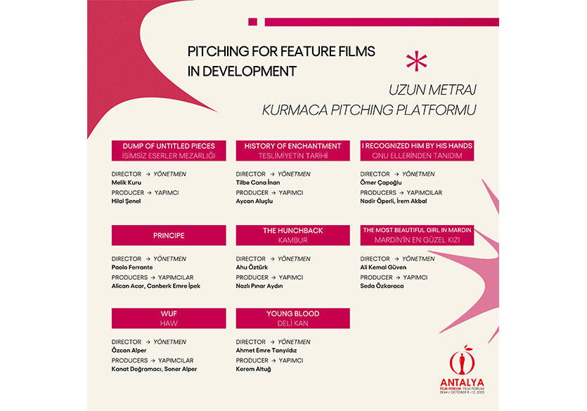 Antalya Film Forum’da bu yıl Uzun Metraj Kurmaca Pitching Platformu’na 68, Sümer Tilmaç Antalya Film Destek Fonu Pitching Platformu’na 6, Dizi/Kısa Dizi Pitching Platformu’na 75 proje başvurdu. Uzun Metraj Kurmaca Pitching Platformu’nda yarışacak 8 projeyi yönetmen, yapımcı Ekin Çalışır, yönetmen-senarist Elif Refiğ ve Creative Europe MEDIA desk - Bulgaristan direktörü Kamen Balkanski’den oluşan seçici kurul belirledi.