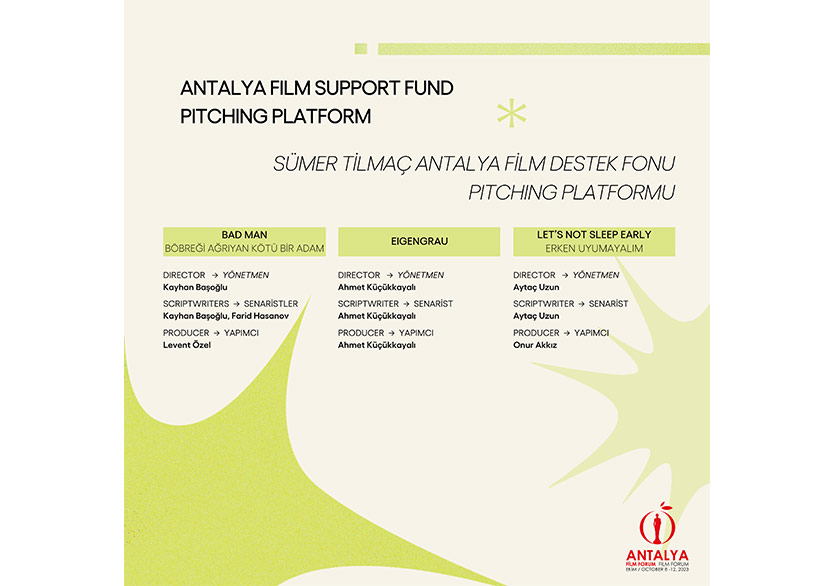 Antalya’yı Türkiye ve dünya film endüstrisinin önemli merkezlerinden birine dönüştürmek amacıyla en az üçte ikisi Antalya’da çekilecek bir filme katkı sağlayan Sümer Tilmaç Antalya Film Destek Fonu Pitching Platformu’na başvuran projeler yönetmen-senarist Abdurrahman Öner, yönetmen-senarist Burcu Aykar ve yönetmen-senarist Çiğdem Vitrinel tarafından değerlendirildi. Böbreği Ağrıyan Kötü Bir Adam (yönetmen: Kayhan Başoğlu, senaristler: Kayhan Başoğlu, Farid Hasanov, yapımcı: Levent Özel); Eigengrau (yönetmen, senarist ve yapımcı: Ahmet Küçükkayalı, ortak yapımcılar: Selma Babajic, Ulrich Kunz) ve Erken Uyumayalım (yönetmen ve senarist: Aytaç Uzun, yapımcı: Onur Akkız) adlı projeler Sümer Tilmaç Antalya Film Destek Fonu Pitching Platformu’nda verilecek 200 bin TL değerindeki ödül için ana jüri tarafından değerlendirilecek. Seçilen film aynı zamanda Fono Film tarafından verilecek Fono Film Post Prodüksiyon Ödülü’nün de sahibi olacak.