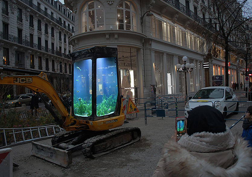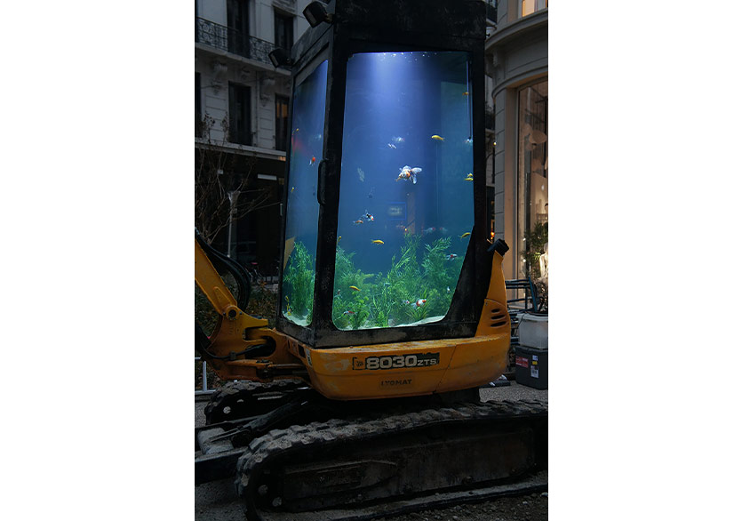 Disko topundan bir çimento kamyonu, arabadan jakuziler derken Benedetto Bufalino bu kez karşımıza daha enteresan bir çalışma ile çıkıyor. İş makinasından akvaryum!
