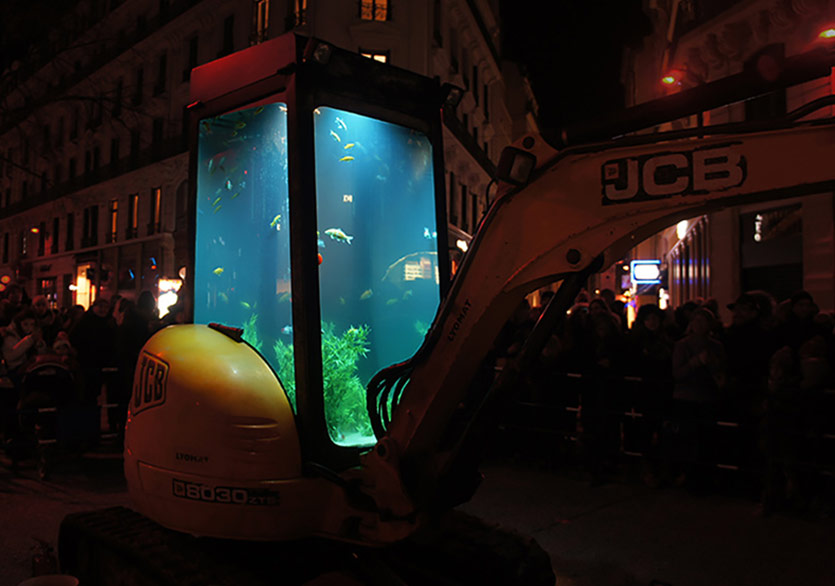 Hicivli çalışmalarıyla tanıdığımız Benedetto Bufalino, ışık sanatçısı Benoit Deseille ile iş birliğine girerek bir akvaryum oluşturdu. Fransa’nın Lyon şehrinde gerçekleşen “Féte des Lumières 2017” programında gösterilen La Pelleteuse Aquarium adlı çalışma oldukça ilgi topladı.