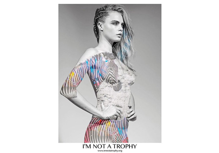 Hayvan hakları konusunda bilinçlendirme ve bilinçsiz avlanmaya karşı bir tutum sergilemek amacıyla I’m Not A Trophy kampanyası için kamera karşısına geçen dünya devi markaların aranılan yüzü ve modeli Cara Delevingne oldu. Cara Delevingne harici kampanyaya önümüzdeki günlerde birçok modelin, aktör ve aktrisiin katılacağı haberi gelirken henüz kimlerin projeye dahil olacağı konusu kesinlik kazanmadı. Katılımcıların vücutlarına türü tükenme tehlikesi altında olan aslan, fil, goril ve leoparların fotoğraflarının yansıtılmasıyla poz verdikleri kampanya çekimlerinin geri kalanını görmek için sabırsızlanıyoruz. Çekimleri Fransız sanatçı ve fotoğrafçı Arno Elias’a ait olan kampanyanın detaylı içerik bilgisini edinmek adına imnotatrophy.org adresini inceleyebilirsiniz.