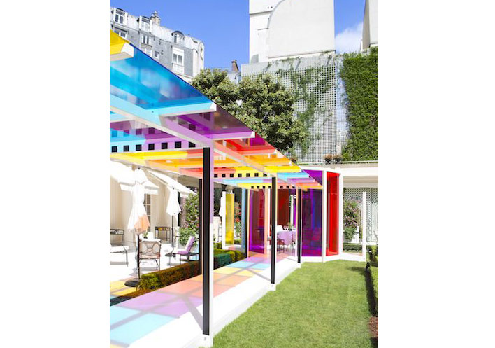 Kameriyenin adı Une Pause Colorée, yani: Renkli Bir Mola! Buren projeyi geliştirirken standart bir kameriyenin yapısına sağdık tahta iskeleti sarı, turuncu, kırmızı, mor ve mavi renkli transparan panellerle birleştiriyor. Sonuç? Elden limonatanın düşmemesi gereken bir keyif mabedi.