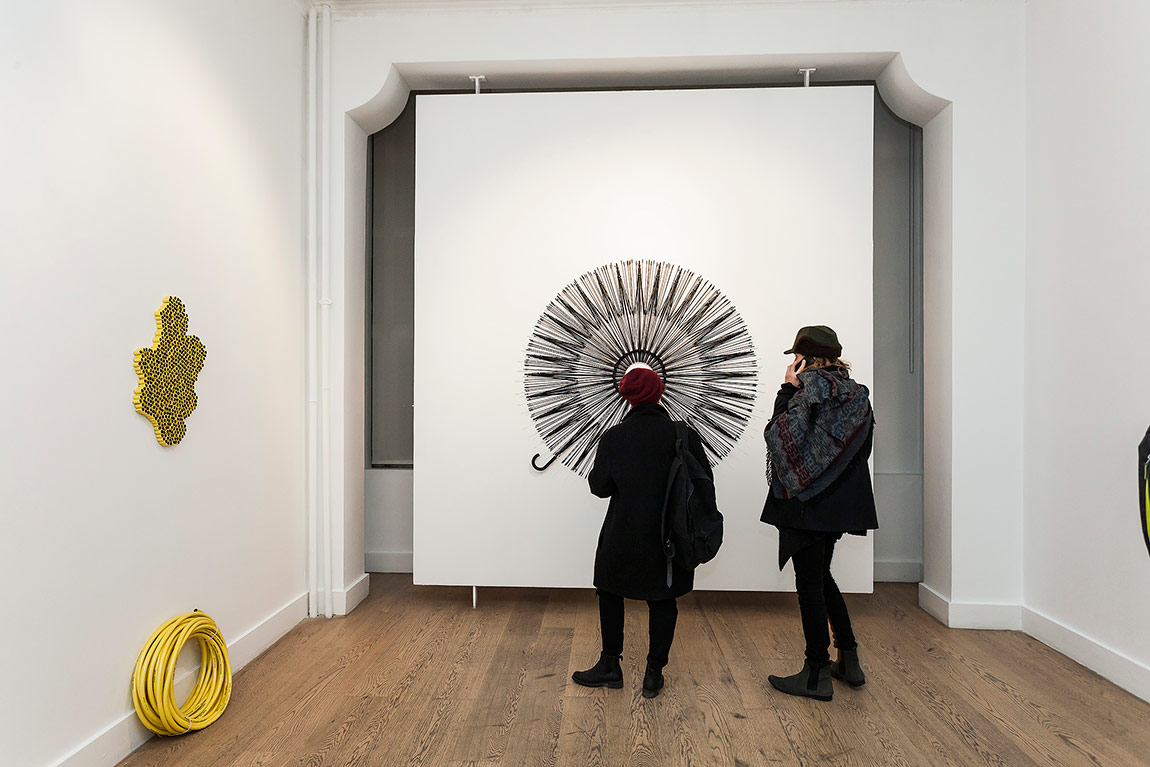 Galerist, Şakir Gökçebağ’ın ‘Think Tank’ isimli kişisel sergisine 20 Ocak – 14 Şubat 2015 tarihleri arasında ev sahipliği yapıyor. Gündelik hayatta sıkça kullanılan hazır nesneleri dönüştürerek yaptığı yerleştirmelerle tanınan Gökçebağ, eserleri aracılığıyla izleyicinin kalıplaşmış algısını altüst ederek, yeni anlayış ve görme olanakları yaratır. Yapıbozumu ve seri çoğaltma teknikleriyle işlevlerinden uzaklaştırdığı eşyalar, benzersiz formlarıyla sanat objeleri olarak öne çıkarlar. Şakir Gökçebağ, eser üretimi için öncelikle seçtiği hazır nesneleri ve onların her bir parçasını detaylı olarak inceler. Sayısız denemeler sonrasında yarattığı düzinelerce olasılık arasından seçtiği objeleri mekana özel olarak uygulayan sanatçıya kimi zaman da mekan esin kaynağı olmaktadır. Sergiye ismini veren ‘Think Tank’ sanatçıya göre ‘görsel düsünce üretimi’ anlamındadır. Gökçebağ, sergide yer alan aynı başlıklı yerleştirmesinde bahçelerde bitkileri tutturmak için kullanılan demir örgülerden yeni bir form oluşturarak görsel bir bulmaca yaratır ve imgesel bir düşünce önerisi ortaya koyar. Günlük yaşamda işlevleriyle kodladığımız nesneleri yapıbozumu, seri çoğaltma ve karşıtlıklar aracılığıyla yeniden konumlandırır ve onlarları salt birer form olarak algılamamıza yol açar. Sanatçı, kömür ve patlamış mısır kullanarak ürettiği ‘Pop Art #2’ başlıklı yerleştirmesinde, malzemelerin doku, renk, anlam ve boyut zıtlıklarından yola çıkar. ‘Gökkubbeler’ isimli eserinde ise siyah şemsiyenin iç yüzüne beyaz ipler gererek geometrik formlar meydana getiren bir gökkube haritası oluşturur. İlk defa Galerist’te gösterilecek olan, sanatçının sebze ve meyveleri kullanarak ürettiği ‘Cuttemporary Art’ serisinin devamı niteliğindeki ‘KL1 (Kırmızı Lahana)’ ve ‘KL2’ isimli yerleştirmeleri izleyiciye fotoğraf olarak sunulur. Tahta mandal, elbise askısı, şemsiye, terlik, hortum gibi tanıdık objelerle oluşturulmuş yerleştirmelerin yanı sıra, geçtiğimiz yıl Hollanda’da gerçeklestirdiği, içi su dolu kovaların yanyana dizilmesi ve aralarına yerleştirilen su terazilerinden oluşan ‘Horizon 2 ve 3’ de sergide izlenebilecek eserler arasındadır. Yerleştirmelerinde Fluxus, Minimalizm, Bauhaus, Dadaizm, Pop-Art gibi farklı sanat akımlarından izler taşıyan sanatçı, şiirsellik, mizah, çözümleme ve yalınlaştırmalar aracılığı ile yeni önermelerde bulunur.