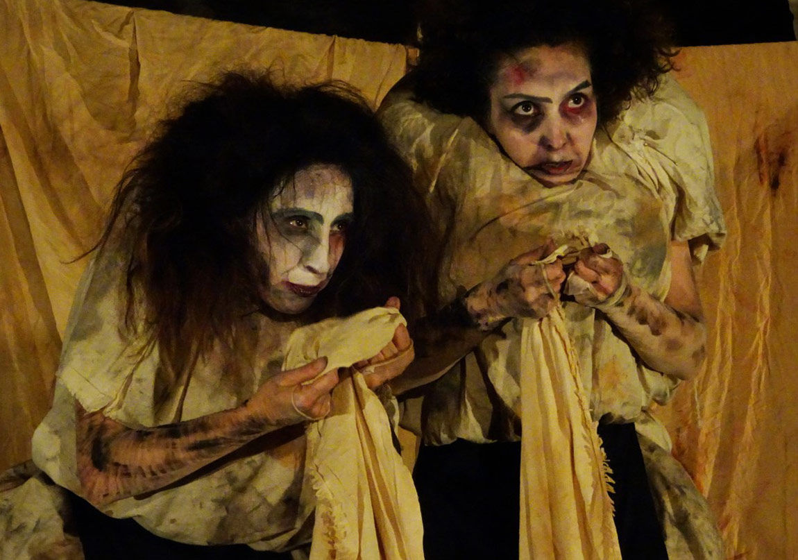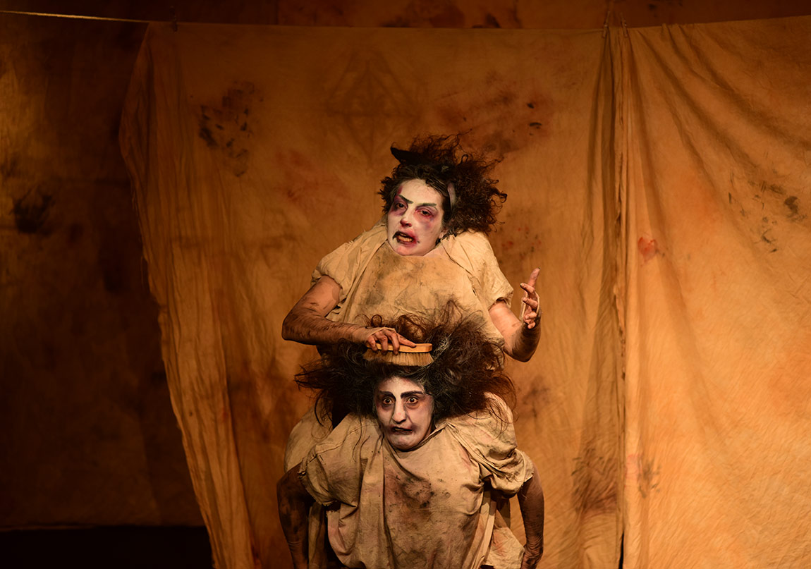 Macbeth, Hamlet'le birlikte en çok uyarlaması yapılan oyunlardan biri. Her zaman, her iklimde yaşanan hikâyesi ile tiyatrolar ve seyirci için cezbedici yönleri olan bir oyun. Çamaşırcı kadınlar oyunun başında söylüyorlar zaten bunun bildiğimiz bir hikâye olduğunu. Ama şişirilmiş göbekleri, bir maskeyi andıran çirkinleştirilmiş, pis suratları, kirden vıcık vıcık yapışan, yağlı, dağınık saçları, kan ve irine bulanmış kambur ve şekilsiz bedenleriyle canlandırdıkları hikâye, ne kadar bilindik de olsa bu sunuş biçimi kesinlikle yeni ve farklı. İplere asılmış kirli ve kanlı çarşafların arasında kendi dönüştürülmüş, başkalaşmış bedenleri, boğuk ve tuhaf sesleriyle konuştukları dile de yabancılaşarak bir süre oflayıp pufladıktan sonra anlatıyorlar bize soylu Macbeth'in hikâyesini. İki kirli çamaşırcı kadının bedeninde Macbeth'in suçunu, günahını, cinayetini canlandırırken çok daha özgür hareket etme cesaretini buluyorlar. Arada bir seyirciyle konuşuyor, sorular soruyorlar. Onlar bu tuhaf kılıkları içinde kukla tiyatrosunu da hatırlatan aykırı hareketleriyle Shakespeare'in grotesk birer soytarısı gibiler. Kimi zaman saçmalıyor, kimi zaman bilgece sözler ediyorlar. Mimik ve pandomimi ustalıkla kullanan jestleriyle o denli ilgi çekiciler ki, seyircinin dikkatini bir an bile dağıtmıyorlar.