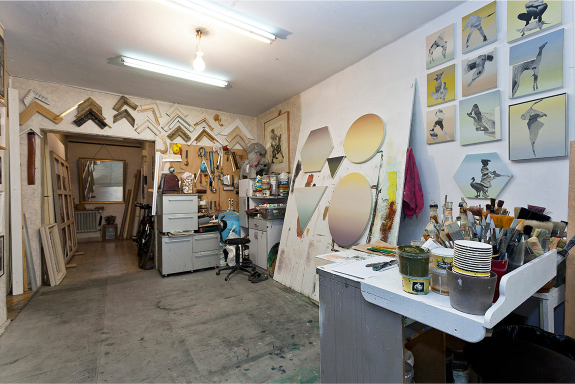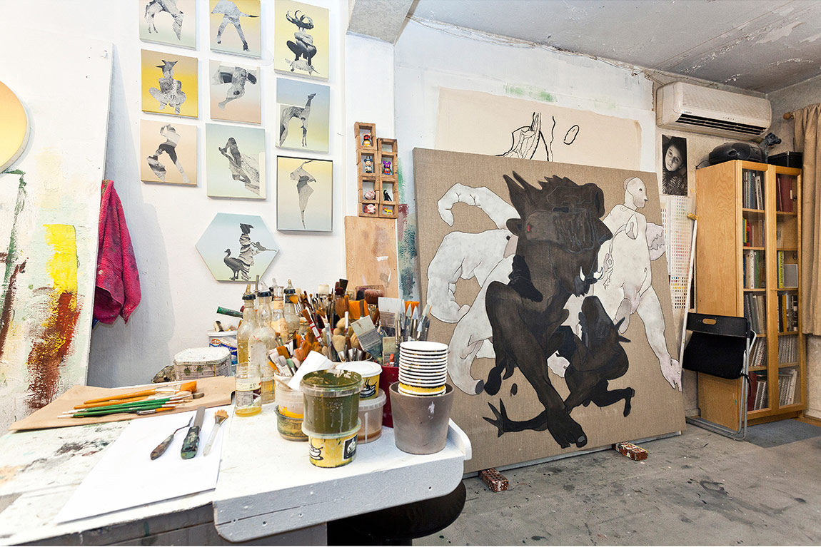 Yaklaşık yirmi senedir bu atölyedeyim. Üretimlerimi atölyede gerçekleştirdiğim için atölye benim için çok önemli. Dışarıdan topladığım her şeyi (fotoğraf, boya, malzeme vs) buraya getirim. Bütün çalışma performansım atölyede gerçekleşiyor, haliyle de her şeyi burada deniyorum.