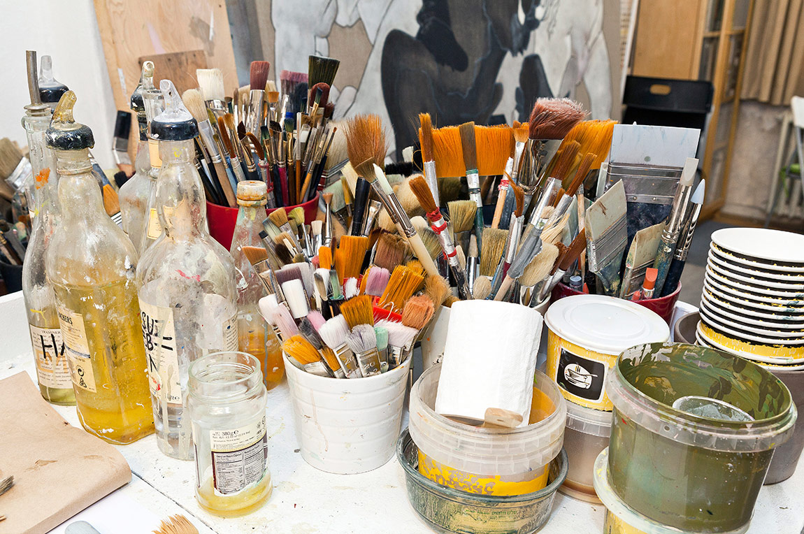 Atölye dışında da çalıştığım oluyor, defterlerim var, dışarıda çiziyorum. Bir atölyem daha var Yeldeğirmeni’nde, orası biraz daha depo gibi, orada daha çok heykel çalışıyorum. Boyalarımı ise genelde burada yapıyorum. Her şey elimin altında olsun istiyorum, malzemelerim fazla fazla olsun, resim yaparken bir rengi bulamamak ya da tuvalimin olmaması benim için olmaması gereken bir durum.