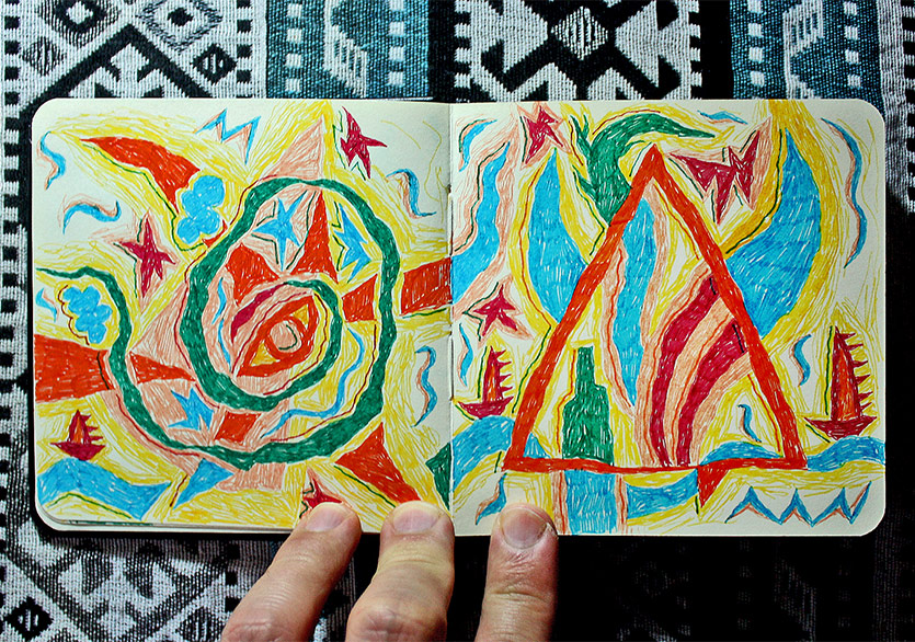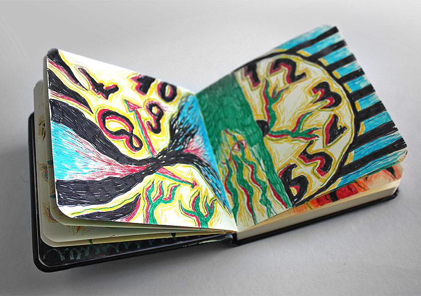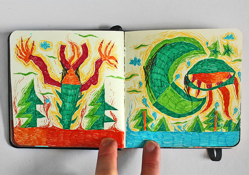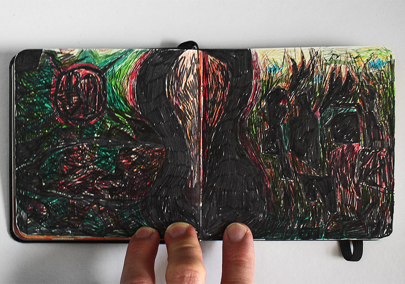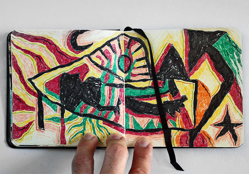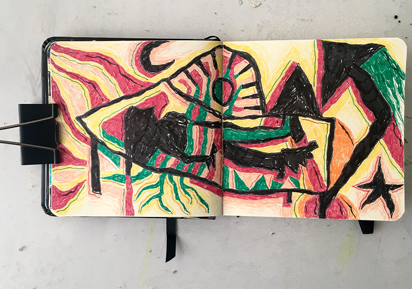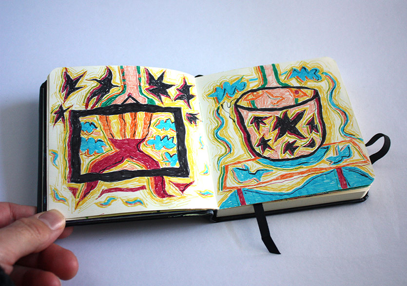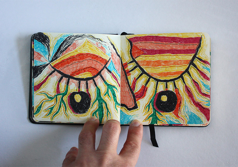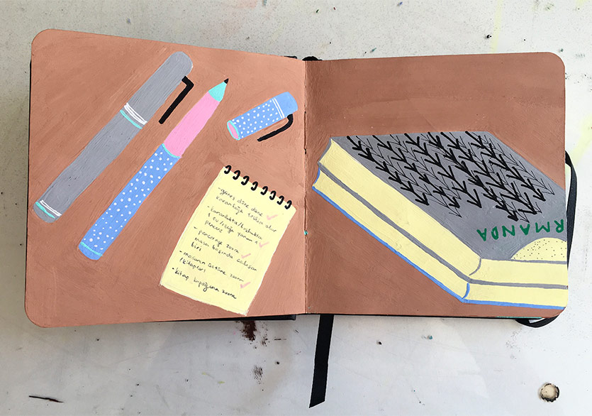 “2 Defter”e gelirsek; askerliğimi yaptığım dönem boyunca yapacak pek bir şeyim olmadığı için çarşıdan not defteri ve renkli pilot kalemler almıştım ve daracık ranzanın alt kısmında bir dolu iş üretmiştim. O dönemden kalma renkli kalem kullanma alışkanlığım devam ediyor fakat tekrar mürekkep, guaj boya kullanımı gibi farklı ve kâğıdın dokusuyla daha uyumlu teknikler denemeye başlayacağım gibi duruyor. Kolaj da aklımdaki şeylerden biri elbette…