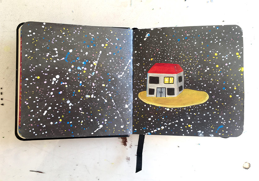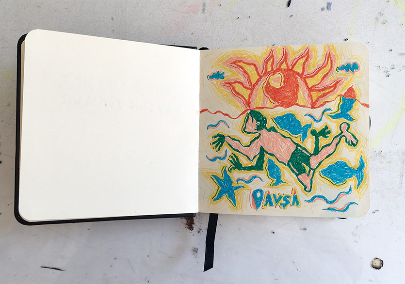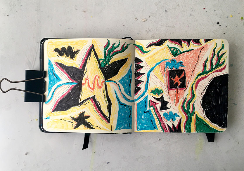 Bundan 10-15 yıl önce hem yurt içi hem yurt dışında denediğimiz ortak defter projeleri aklıma geldi. Birkaç sanatçı anlaşıp defterlere birer sayfa çizdikten sonra aramızda değiş tokuş yapıyorduk. Özellikle bir gündemimiz yoktu o zaman, istediğimiz gibi serbest çizimler yapıyorduk. Eve kapanmış hâldeyken sürdürülebilir bir imkân olarak göründü bana bu fikir. Defterleri de kargoyla yollayabilirdik. Bu fikri zihnimde döndürürken Başar’la sosyal medya üzerinden tanıştık. Tanışma toplantımızı da Zoom üzerinden yaptık. Başar ortak proje yapmayı teklif edince ben de bu fikri önerdim.
