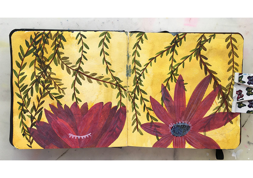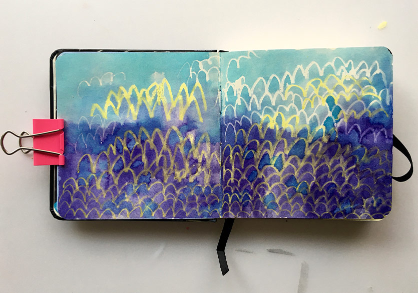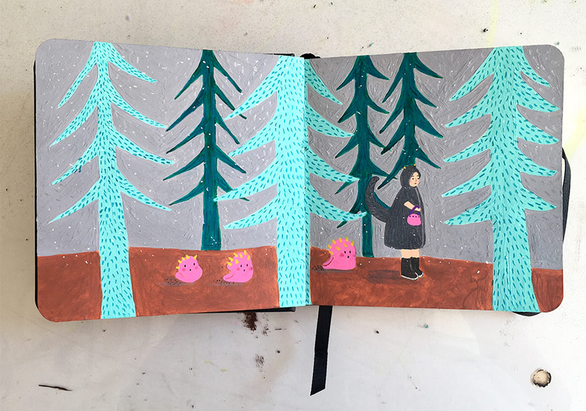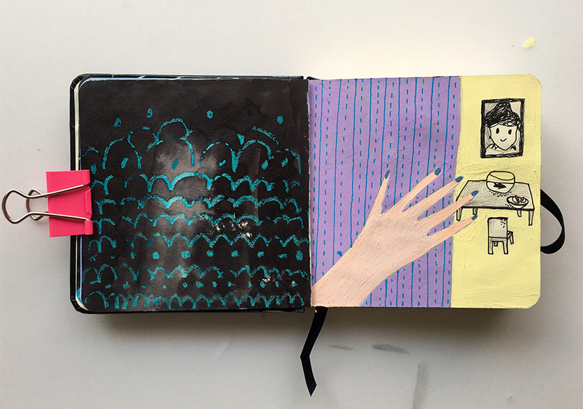 B. K.: Baysan’ın ilk başlarda kullandığı grafik roman anlatım dili beni etkiliyor ama ben onu alıp başka bir yere, daha soyut bir dünyaya götürüyorum sanki. Sonra o da benim bıraktığım yerden alıp beni tekrar başka bir dünyaya götürüp orada bırakıyor. Böyle böyle ilerliyoruz. Malzeme olarak ise kullandığı boyalar ve renkler şimdiden bana ilham verdi. Sayfaları hafifçe kabartıyor ve bu da deftere daha doğal bir özellik katıyor. Ben de deneyeceğim.