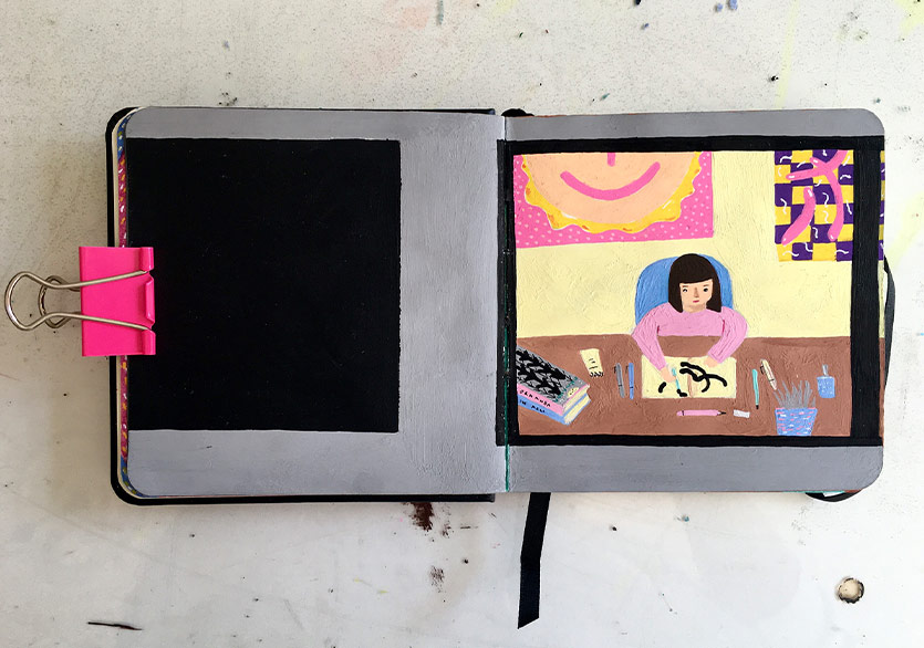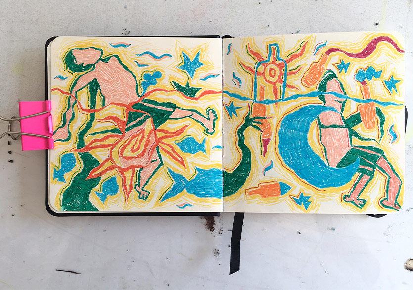 Bu defa serbest çizim yerine diyalog oluşturacak çizimler yapmak odağımdaydı. İşler birbiriyle konuşsun, birbirini dönüştürsün, evrilsin niyetindeydim. Sessiz kitaplardan da ilham alan bir fikirdi bu. Ancak senaryo yerine diyaloğu, deftere çizim yaptığımız zamanın organik akışına bırakmak önemliydi. Projeyi hayata geçirmeye karar verdikten sonra sık sık toplantı yaparak geliştirdik. Defterin boyutundan kaçar sayfa yapıp ne kadar sürede defterleri değiş tokuş edeceğimize beraber karar verdik. Projenin ismi ve kimlik tasarımı da Başar’dan çıktı.