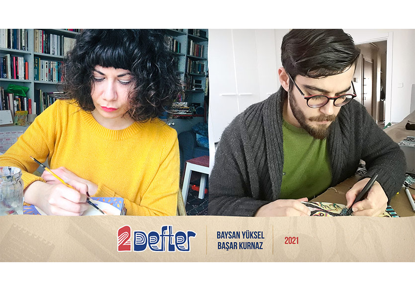 Baysan Yüksel ve Başar Kurnaz ile birer defter aracılığıyla görsel anlatımla bir diyalog geliştirmenin mümkün olup olmadığını araştırdıkları projeleri “2 Defter” üzerine konuştuk.